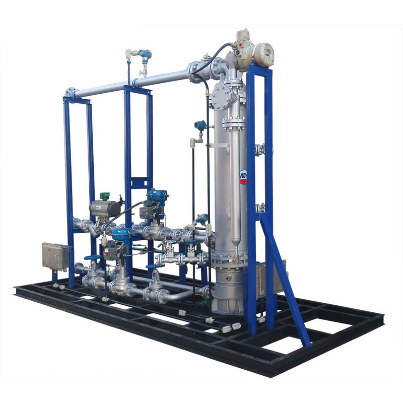 对于1T以上气化能力的气化器,我公司创新性的将气化器、调压装置、进出口连接管路、控制阀门、气液分离器等元件集成在一个撬块上,形成了一个功能较完善的撬装气化装置。