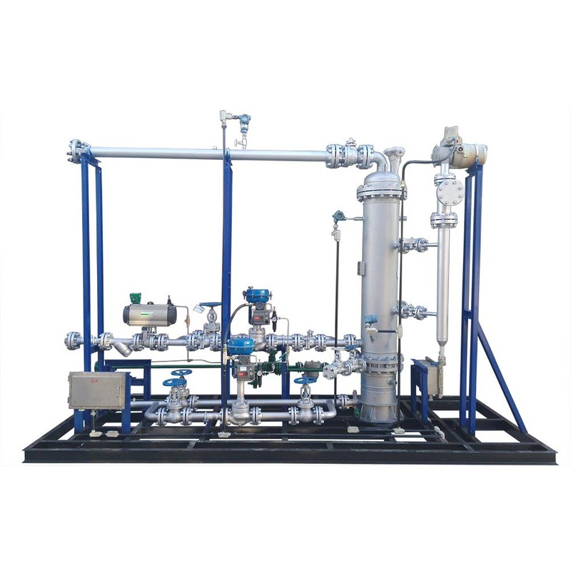 对于1T以上气化能力的气化器,我公司创新性的将气化器、调压装置、进出口连接管路、控制阀门、气液分离器等元件集成在一个撬块上,形成了一个功能较完善的撬装气化装置。